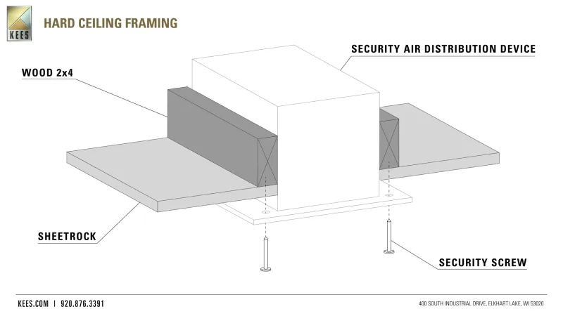 Hard ceilings feature a layer of sheetrock over the roof infrastructure. Security air distribution devices are mounted in openings cut into the sheetrock. For proper installation of security grilles, consider the following: